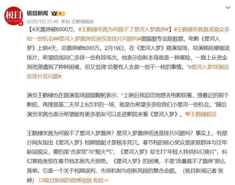 王鹤棣宋茜为何未能挽救《星河入梦》的票房?这部影片票房低迷难道仅仅是排片的问题吗?实际上,部分网友指出,《星河入梦》档期错配才是其根本症结所在。春节档的核心受众主要是家庭群体以及泛年龄层观众,他们所追求的是“合家欢”与“烟火气”,而《星河入梦》主打“年轻人特供科幻爽片”,科幻冒险类型在春节档本身就处于先天劣势。《星河入梦》所面临的困境,并非“流量救不了票房”这般简单配资炒股免费,它实则是一个涉及档期误判、市场机制以及创新风险的复合难题。