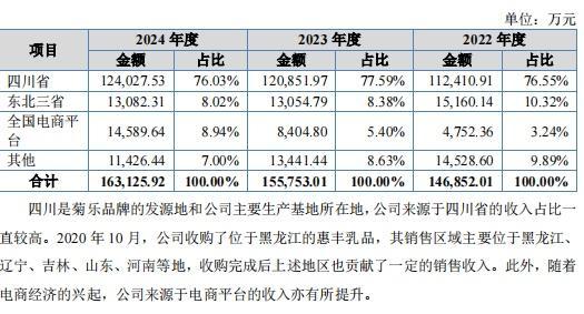 财务数据显示,菊乐股份在四川区域营收占比常年在76%以上。2022年-2024年公司来源于四川省的收入占比分别为 76.55%、77.59%和76.03%。2024年,公司在四川省区域的营业收入达12.4亿元,占比超76%;东北三省营收1.31亿元,占比8.02%,全国其他电商平台营收1.46亿元,占比约9%,其他区域及渠道占比7%。