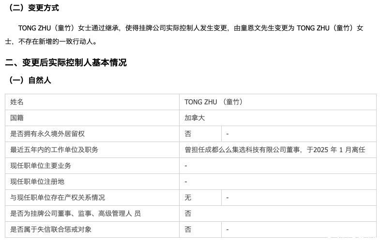 童恩文离世之后,9月17日,公司宣布实际控制人拟变更为其女儿童竹。菊乐股份在公告中表示,童竹通过继承,使得挂牌公司实际控制人发生变更,由童恩文先生变更为童竹,不存在新增的一致行动人。本次继承完成后,童竹合计拥有菊乐股份权益 6784.02万股,占比 73.35%。